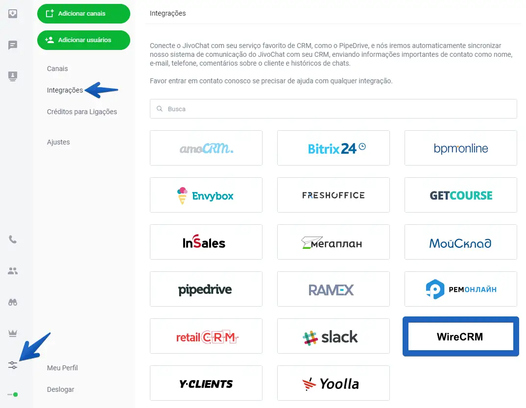Para integrar o WireCRM ao JivoChat, abra o aplicativo web do JivoChat ou o aplicativo para Desktop, acesse as Configurações -> Integrações -> e clique em WireCRM.