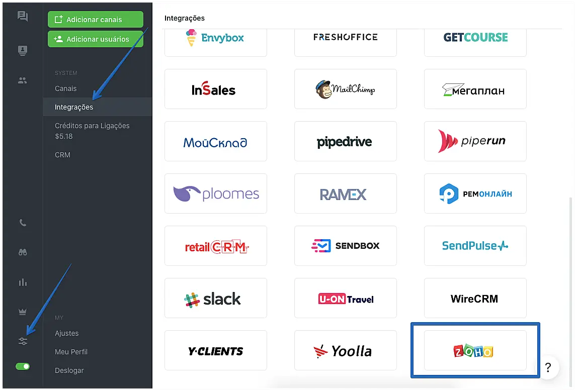 Para integrar o Zoho CRM ao JivoChat, abra o aplicativo web do JivoChat ou o aplicativo para Desktop, acesse as Configurações -> Integrações -> e clique em Zoho CRM.