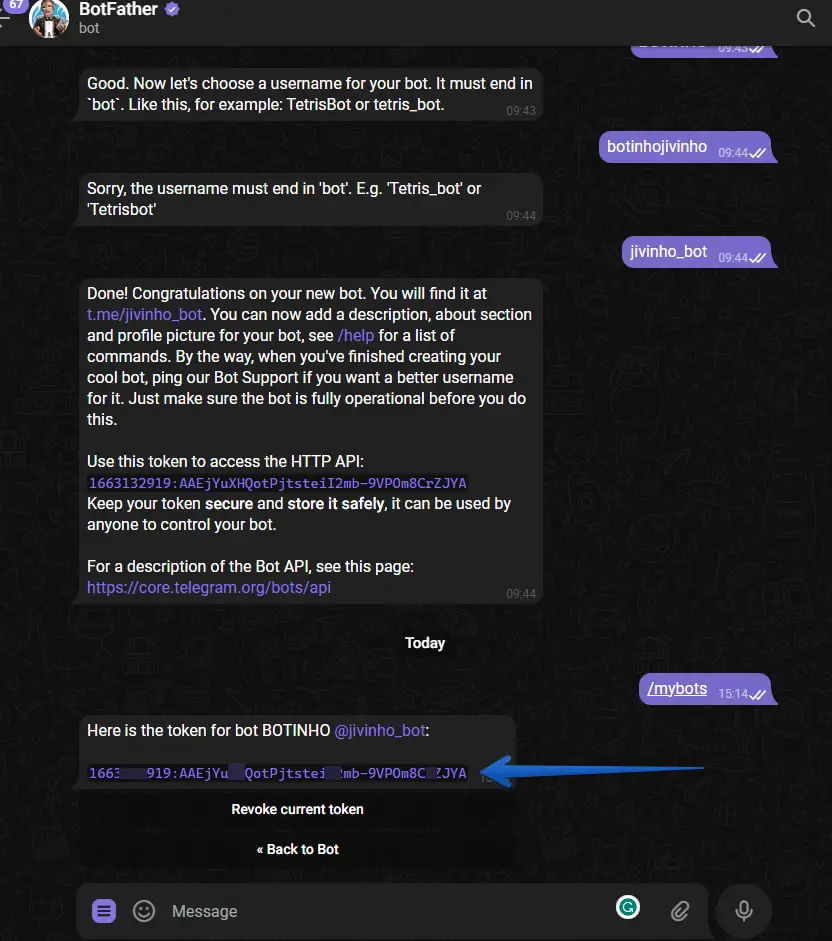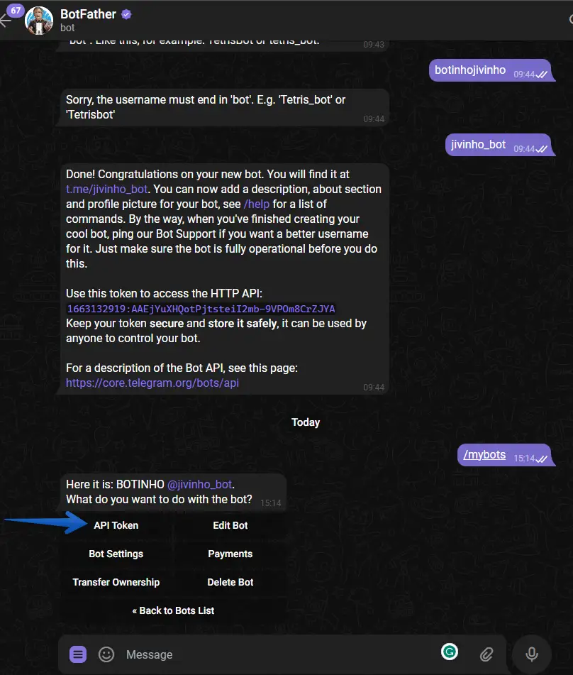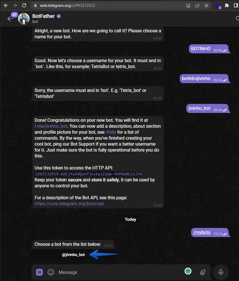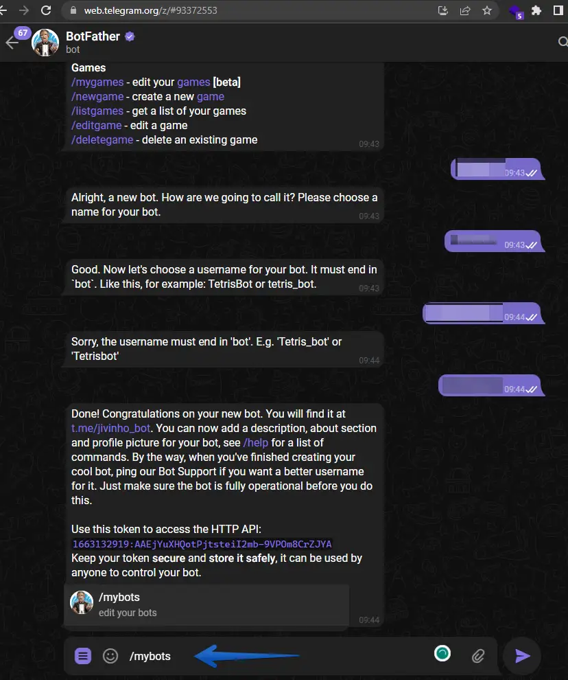 3 - Dentro da janela de conversa, digite /mybots