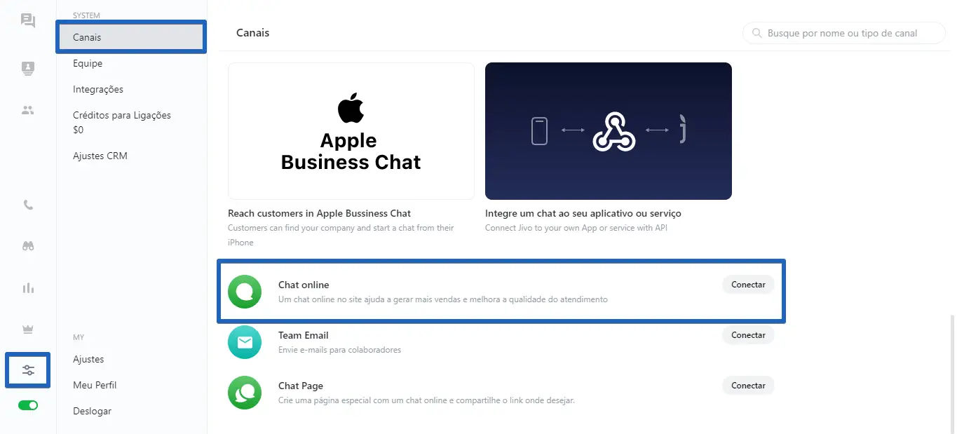 Acesse o aplicativo web do JivoChat ou um de nossos aplicativos para Desktop e siga para Configurações-> Canais, encontre e conecte um canal de "Chat Online".