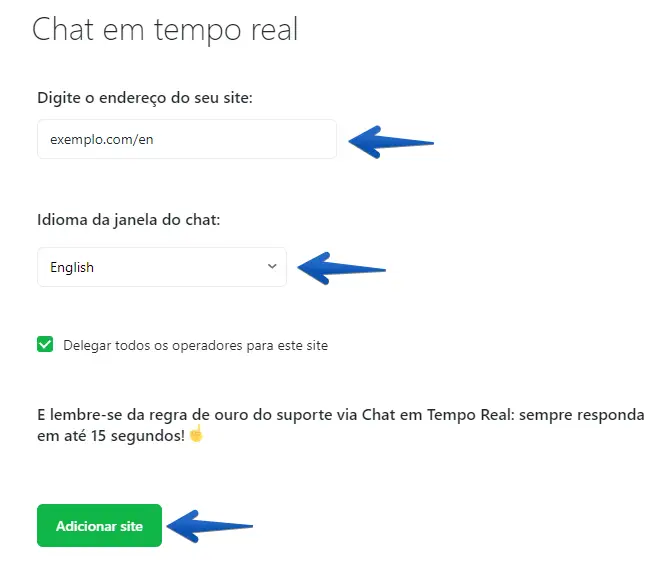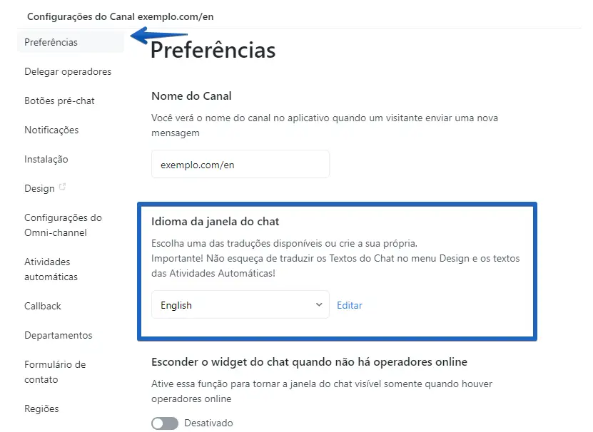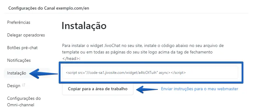 Após todas as alterações serem feitas, instale nos templates de idiomas do seu site o código do chat, encontrado nas configurações de cada canal criado.