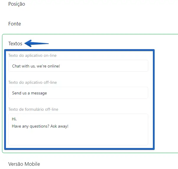 Se desejar customizar algum texto ou criar uma tradução manual do chat para idiomas não existentes na lista de idiomas nativos, poderá fazê-lo clicando no botão "Editar" ao lado direito da escolha do idioma da janela do chat.