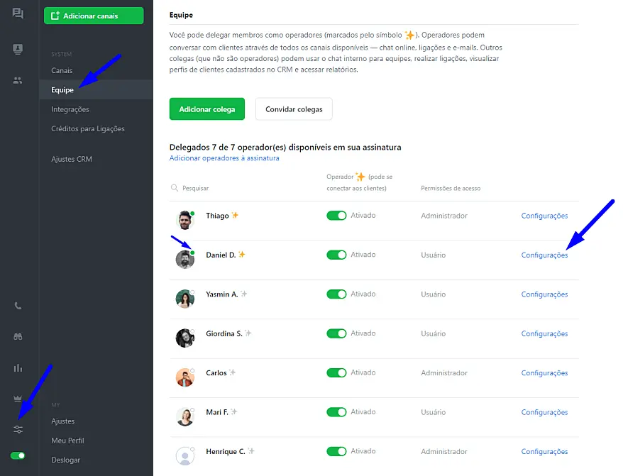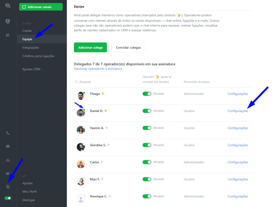 VIPPROBASEFREEPara desconectar operadores basta entrar como administrador em seu painel Jivochat e ir em Configurações > Equipe, clique em Configurações do operador que deseja desconectar, como mostrado na imagem abaixo.