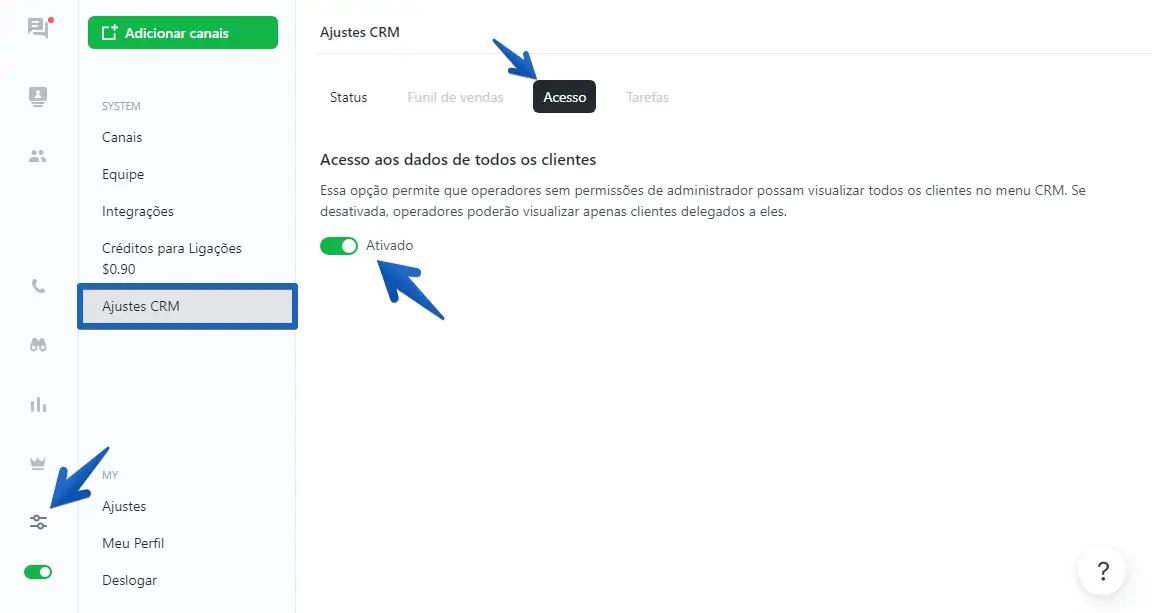 1. Acesse seu app web do JivoChat ou qualquer um de nossos apps para Desktop e vá até Configurações -> Ajustes CRM -> Acesso -> Ative a opção Acesso aos dados de todos os clientes.