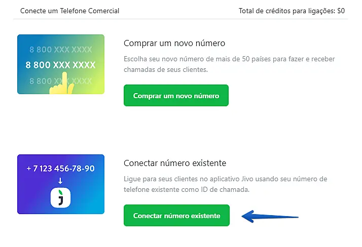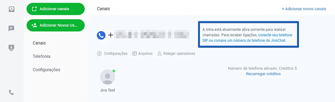IMPORTANTE: se você ativar um número de telefone normal, só poderá fazer chamadas. Para receber chamadas usando o JivoChat, é necessário ativar um número SIP próprio ou adquirir um número de telefone no JivoChat.
