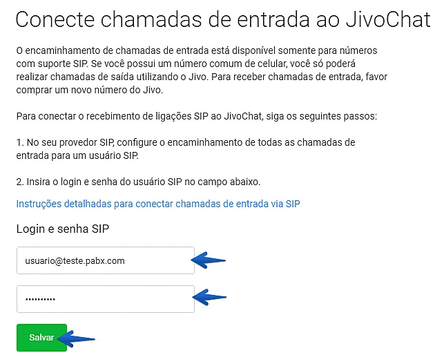 - Insira as credenciais do usuário SIP criado para conectar o recebimento de ligações ao JivoChat.