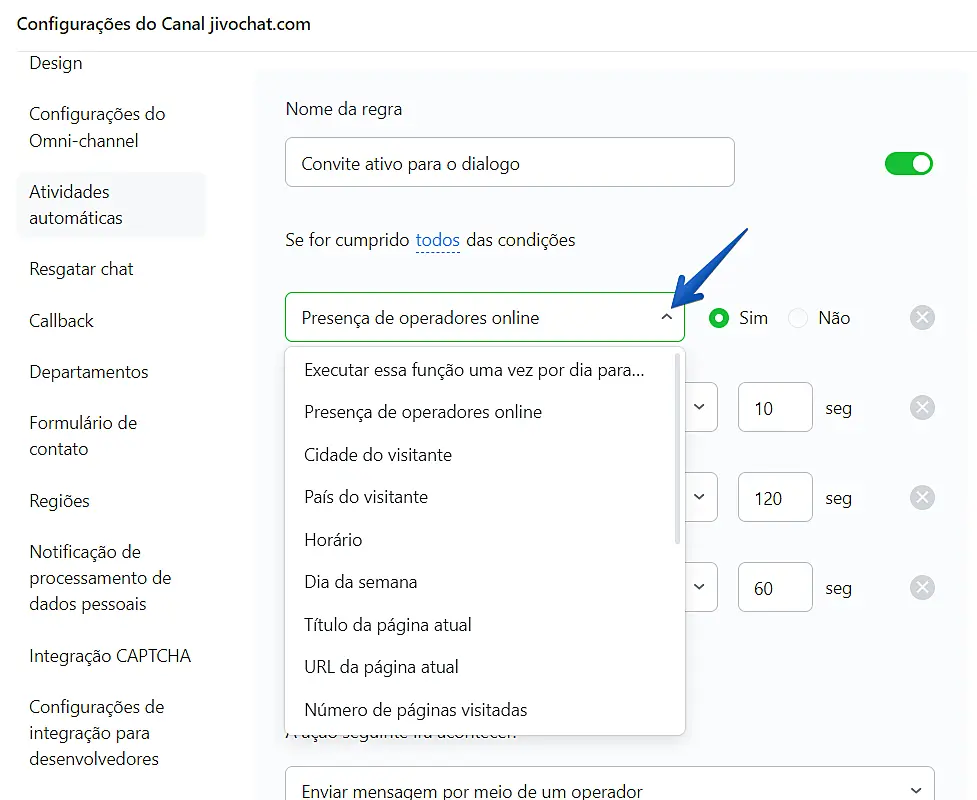 Enviar mensagem por meio de um operador – Automaticamente envia para o visitante um convite para conversa através de um operador. A condição Presença dos operadores on-line: "Sim" é obrigatória.