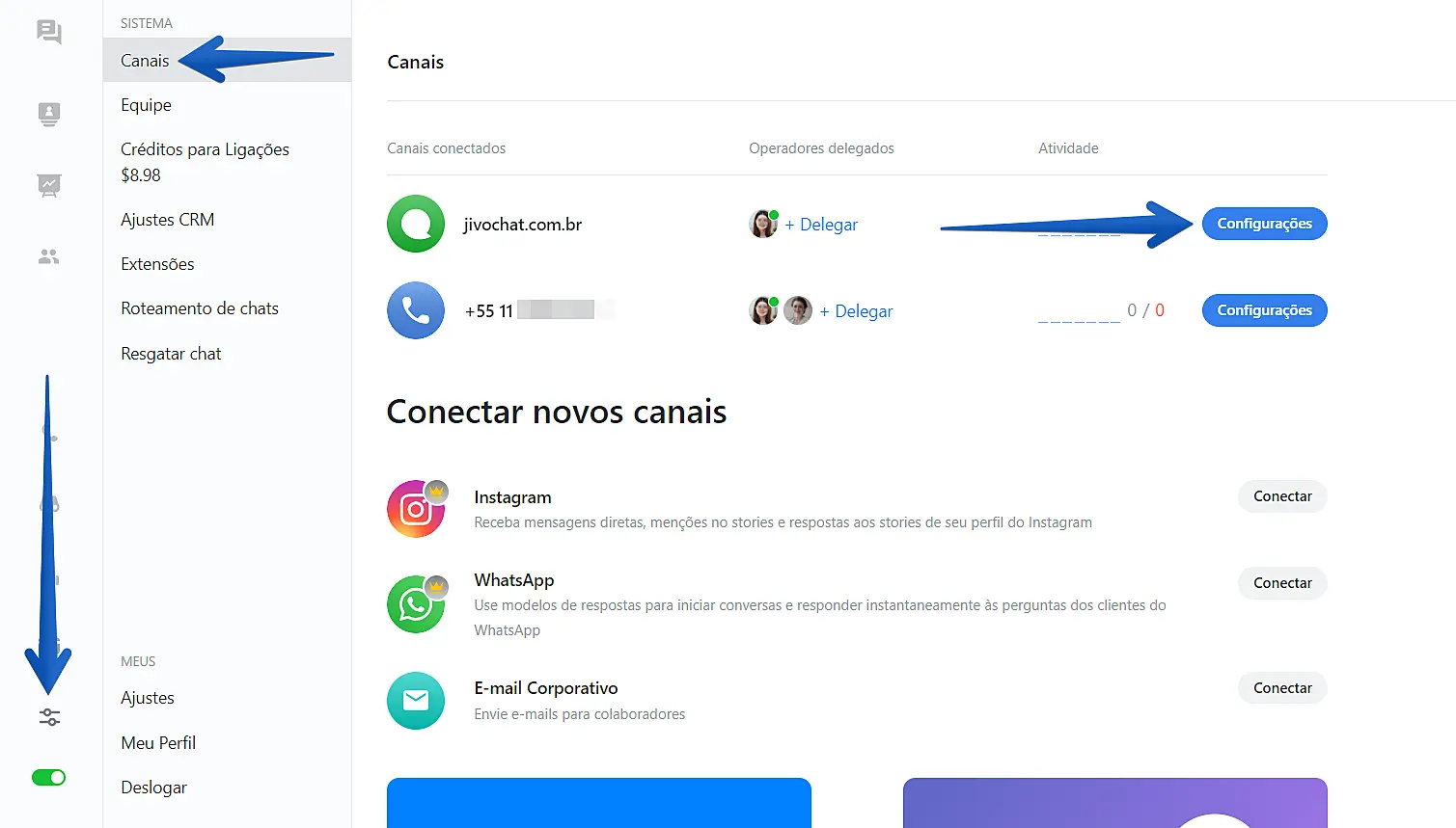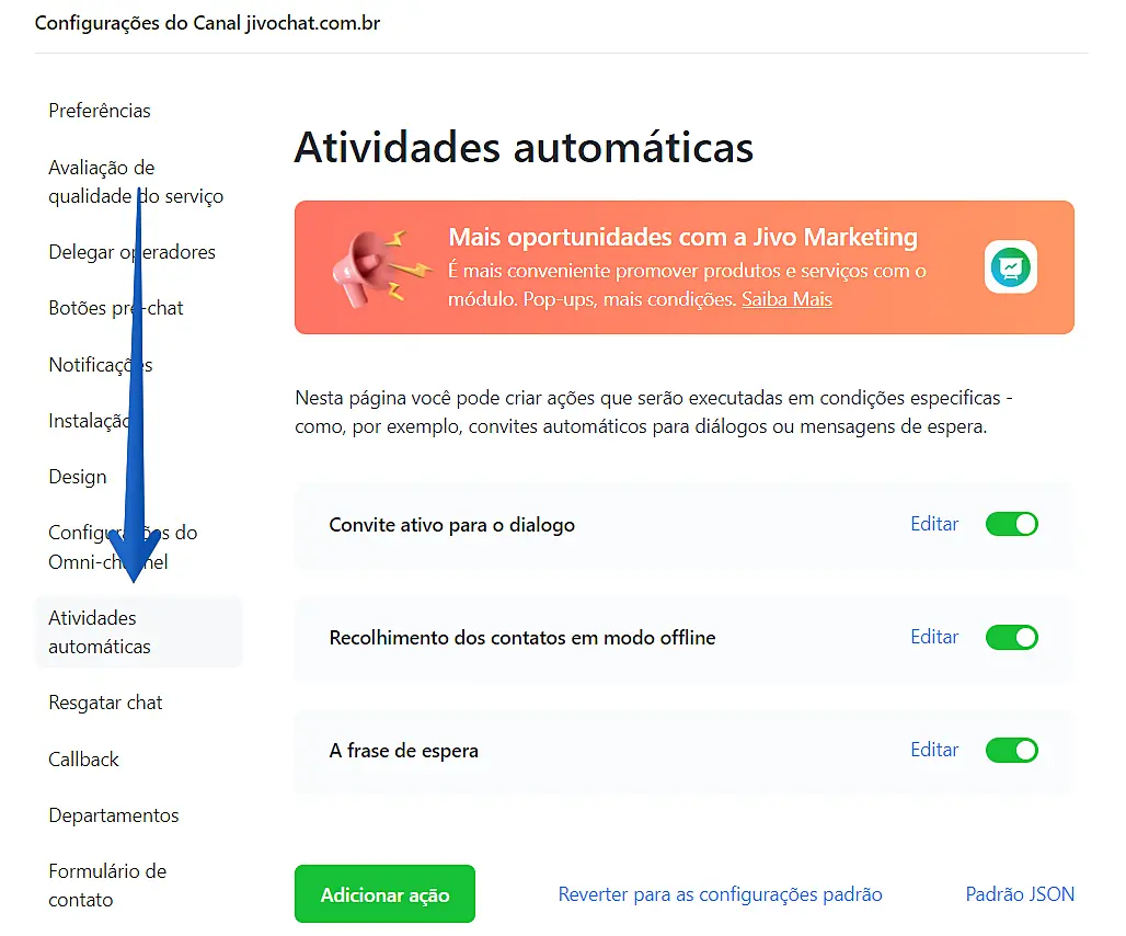 Você pode configurar as atividades automáticas no seu Aplicativo Web da JivoChat ou em um de nossos aplicativos Desktop -> Configurações -> Canais -> Configurações (ao lado do nome do seu site).