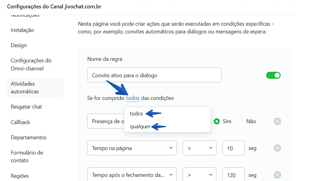 Tempo em página – configura um tempo em que o usuário deve passar na página atual antes de receber um convite pró-ativo. Se o visitante for para uma outra página, essa condição é reiniciada.