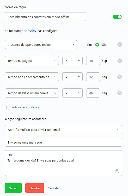 Abrir formulário para enviar um e-mail – Automaticamente abre o formulário off-line do JivoChat, no qual o cliente pode deixar uma mensagem que você receberá via e-mail. A condição Presença dos operadores on-line: "Não" é obrigatória.