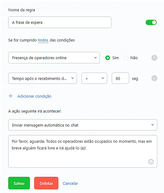 Enviar mensagem automática no chat – Se o cliente enviar uma mensagem no chat e o operador não responder em um tempo específico, essa atividade automática faz aparecer uma mensagem especial para o visitante. A condição Presença dos operadores on-line: "Sim" é obrigatória.