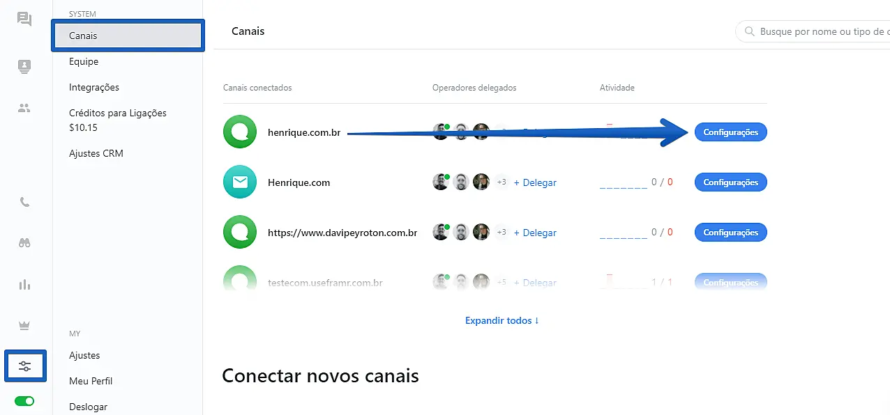 Para fazer isso, abra seu Aplicativo Web da JivoChat ou algum de nossos aplicativos Desktop, e acesse as Configurações -> Canais -> Configurações (ao lado do nome do canal):