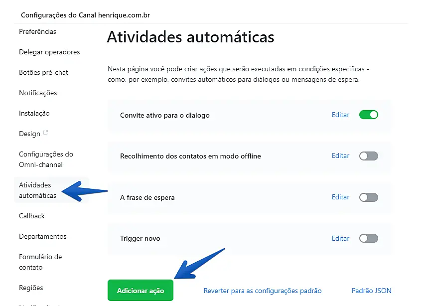 Clique no menu "Atividades Automáticas" à esquerda e depois em "Adicionar Ação".
