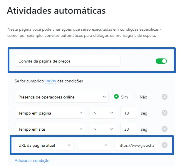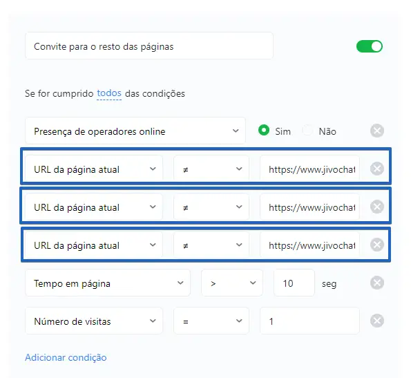 Neste método, você pode criar diversas regras para convites proativos, nas quais você irá configurar convites diferentes para as páginas que desejar utilizando a condição "URL da página atual". Esse método tem um limite máximo de 10 regras.