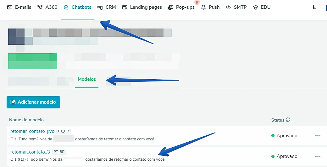 Vá para a sessão "Chatbots" e selecione seu chatbot do WhatsApp. Vá para a guia "Modelos" e clique no botão Adicionar modelo para criar um novo modelo.