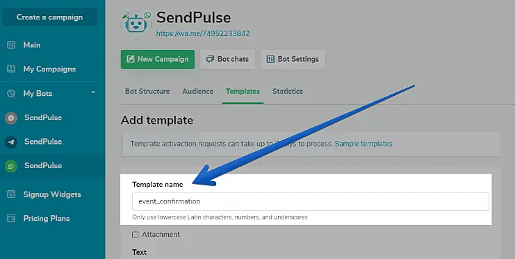 Após todo processo de conexão do seu número à API oficial do WhatsApp Business ter sido feito, agora você vai precisar criar seu template message dentro da sua conta da SendPulse.