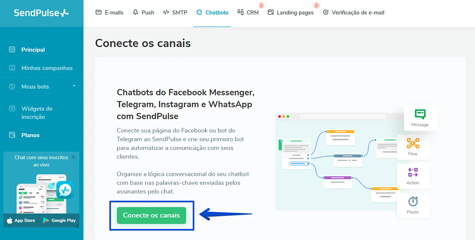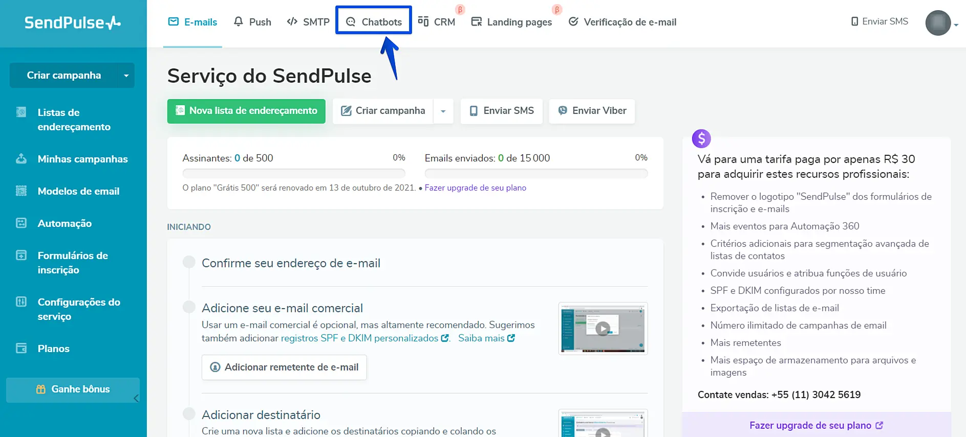Acesse a sua conta da Sendpulse neste link e vá em Chatbots no menu superior.
