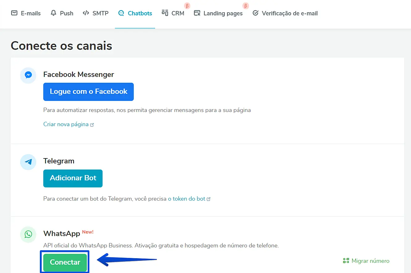 Na página seguinte, dentro da opção de WhatsApp, clique em Conectar.