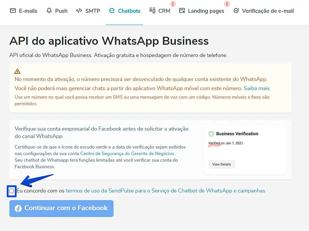 Já com o upgrade feito em sua conta, você verá a tela abaixo -> Marque a caixa de seleção para concordar com os termos de uso da API oficial do WhatsApp.