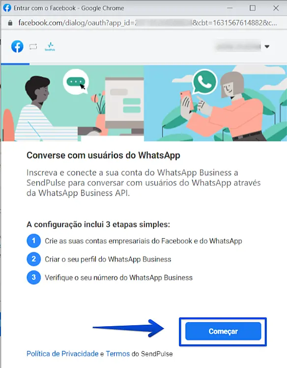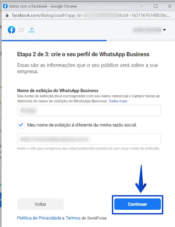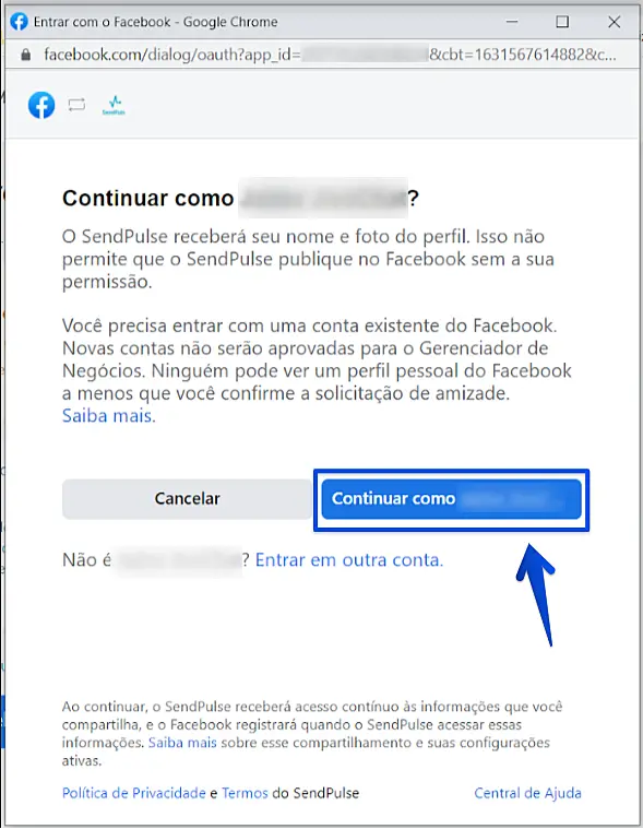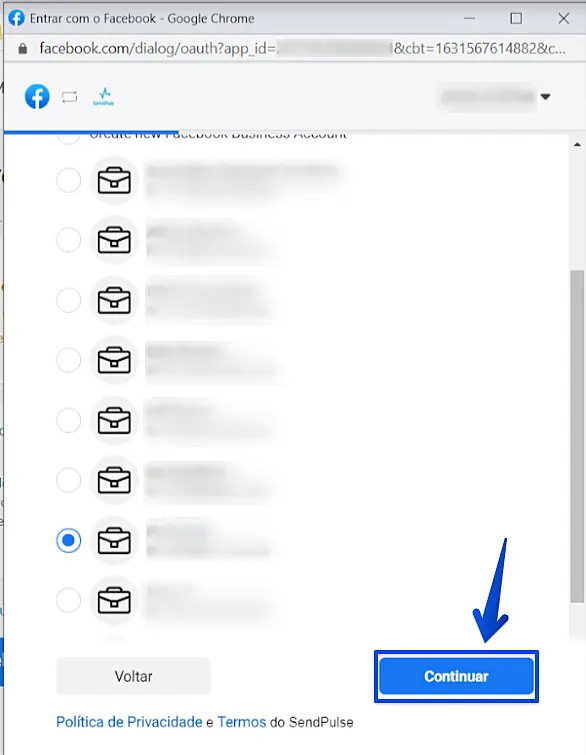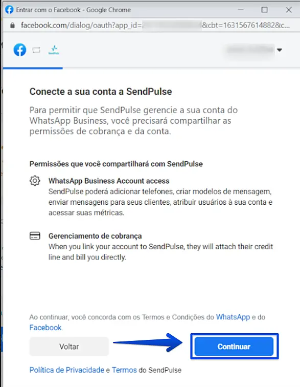 Na próxima tela, permita que a Sendpulse gerencie as suas contas de WhatsApp dentro do Facebook e crie uma conexão entre a sua conta do Gerenciador de Negócios do Facebook com a Sendpulse. Para isso, clique em Continuar.