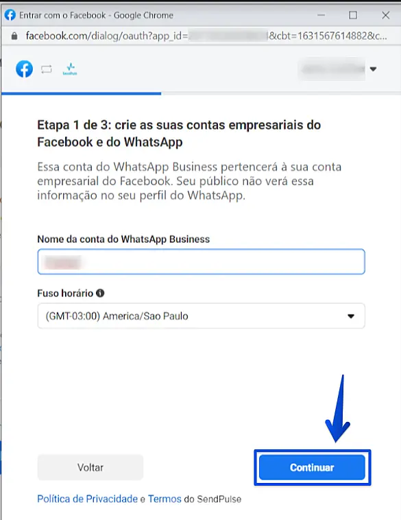 Na próxima tela, você irá escolher o nome da sua conta do WhatsApp Business e o fuso horário da sua conta. O melhor nome a ser escolhido nessa opção é a sua própria razão social. Após digitar, clique em Continuar.