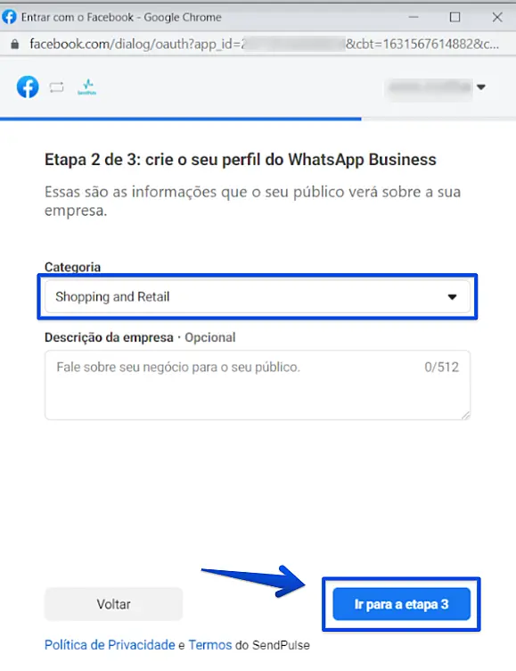 - O nome de exibição que aparecerá para seus clientes, é recomendado que tenha muita proximidade com a sua razão social, para evitar que seu perfil seja negado.