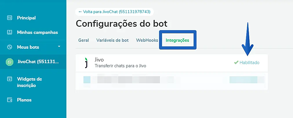 Feito isso, você verá que o botão será trocado por "Habilitado" e será criado um novo canal de API de Chat dentro do seu JivoChat como na imagem abaixo.