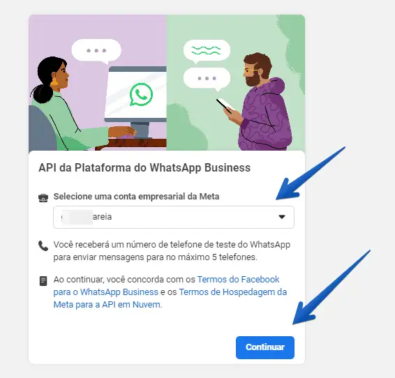 Em nosso tutorial, nós já possuímos uma conta empresarial vinculada ao Meta. Então só precisamos selecioná-la.