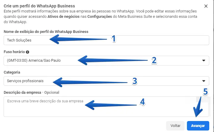 Algumas informações precisarão ser preenchidas, como o nome de exibição do seu WhatsApp Business, o fuso horário, a categoria e uma descrição da empresa (que é opcional).