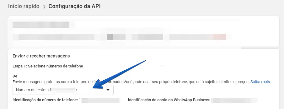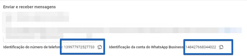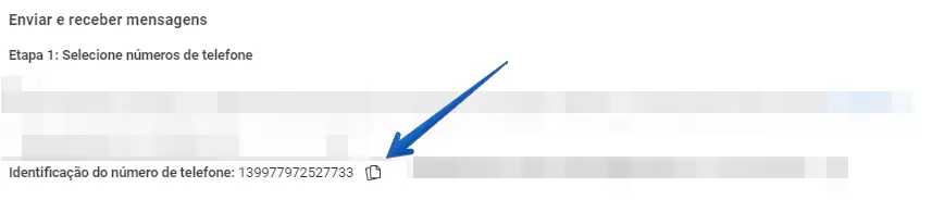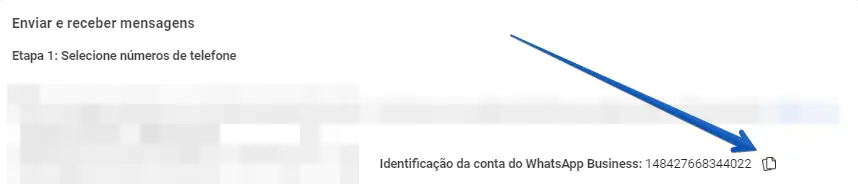 Na etapa 1, você também verá duas informações importantes, que são o ID do número de telefone e o ID da sua conta de WhatsApp Business