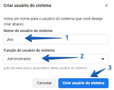 Em seguida, preencha inserindo o nome do "JivoChat" -> Configure a função para "Administrador" e clique em "Criar usuário do sistema"