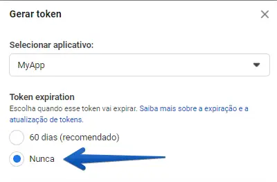 O indicado pela Meta é que seja gerado um token que expire a cada 60 dias, mas lembrando que você terá que ficar atento a isso de acordo com o prazo, pois caso o token expire e não seja renovado, a sua integração irá ser pausada.