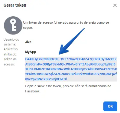O seu token irá aparecer na sua tela. Copie e o salve em algum local seguro, pois você não conseguirá visualizá-lo posteriormente.