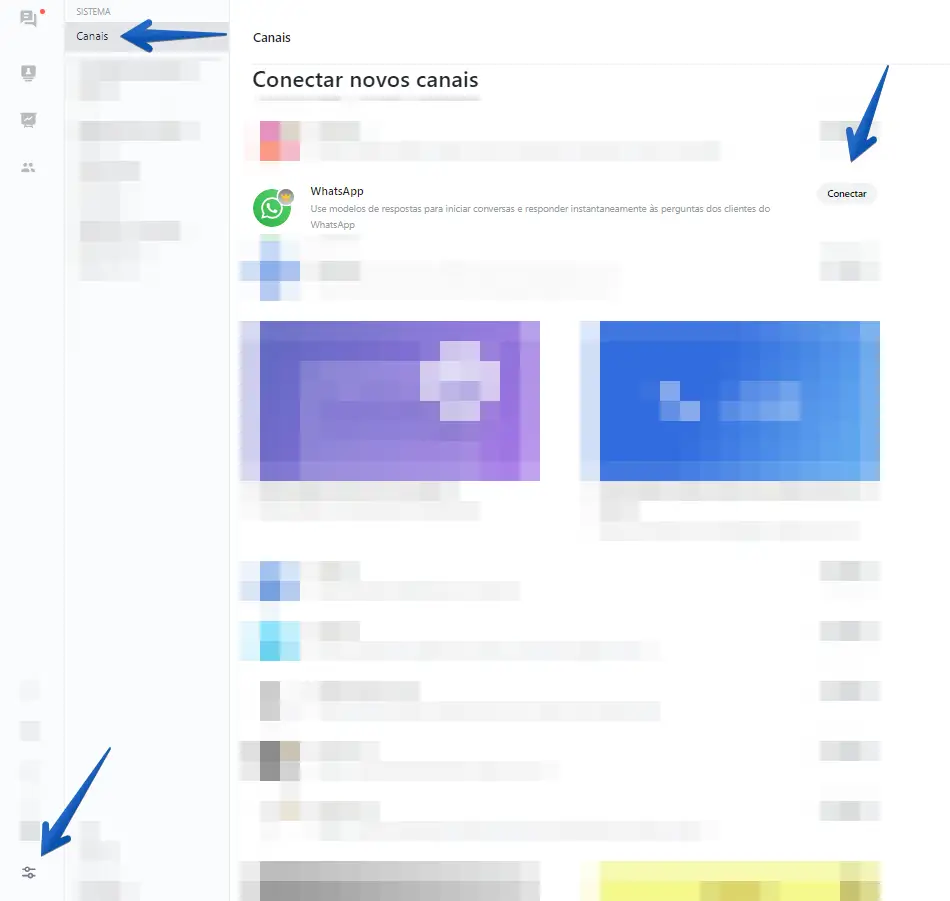 Agora abra o JivoChat, vá em Configurações -> Canais e encontre o WhatsApp nessa janela.