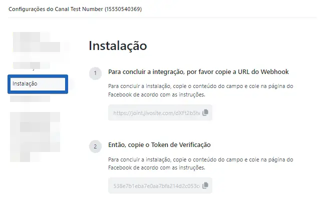 Após preencher os dados, o seu canal será criado e uma nova janela será aberta contendo as URLs para os Webhooks e o Token de verificação gerados pelo JivoChat: