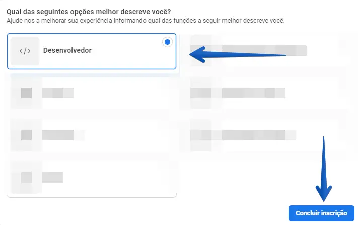 Em seguida, selecione a opção "Desenvolvedor" e clique em "Concluir inscrição"