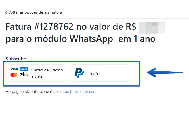 Em seguida, escolha a forma de pagamento, preencha os dados necessários e o módulo será ativado