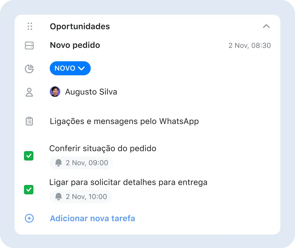 O CRM do JivoChat é uma área de trabalho conveniente para gerenciar processos de vendas e comunicação. É fácil encontrar tudo que precisa, configurar lembretes e gerenciar tarefas